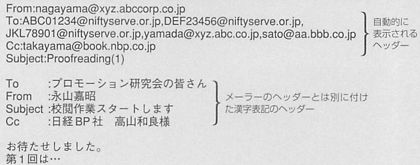 メー ラ一には,ToやCc, Subjectなどのヘッダ一を自?的に表示する機能があり ます。しかし,ToやCcにはメールアドレスがそのまま表示されるので,特に大勢の人にあてたメールのときは,誰に送られているのか受信者にはよくわかりませ ん。そこで,自動的にけられるヘッダーとは別に,ToやCcの先を漢字で表示す ると一見しただけで誰にあてたメールかわかるようになります。